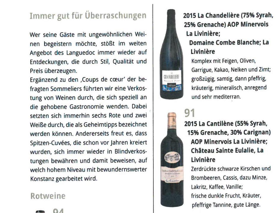 Dans le nouveau numéro de la Revue du Vin de France spécial millésime 2018, c’est notre entrée de gamme « PLAISIR D’EULALIE » 2018 qui a retenu l’attention de la journaliste, avec ce commentaire : » Floral et envoûtant: ce rouge poudré termine sur une finale fraîche » avec en prime la photo du village de LA LIVINIERE !