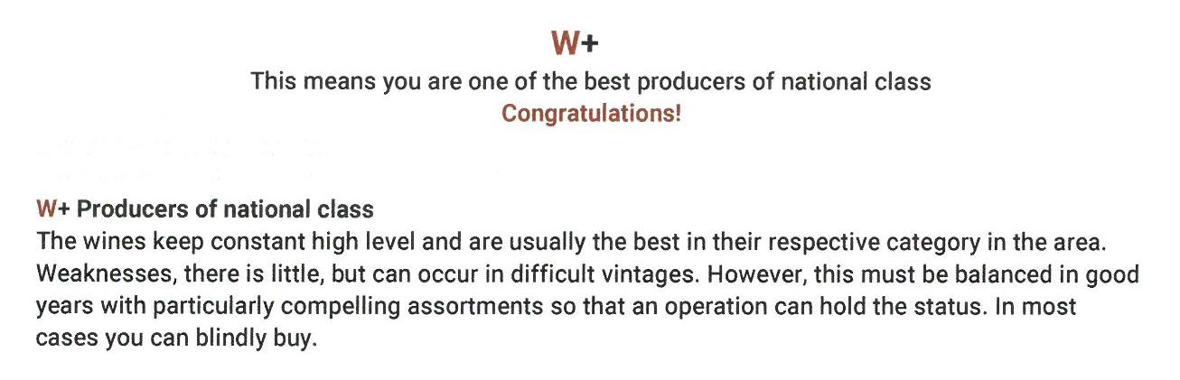 Le site internet Wein + , qui se définit comme indépendant , strict, professionnel et incorruptible nous classe parmi les producteurs « Wein + producers of national class », c’est à dire fiable sur le long terme..